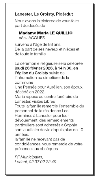 Avis de décès de Madame Maria LE QUILLIO née JACQUES